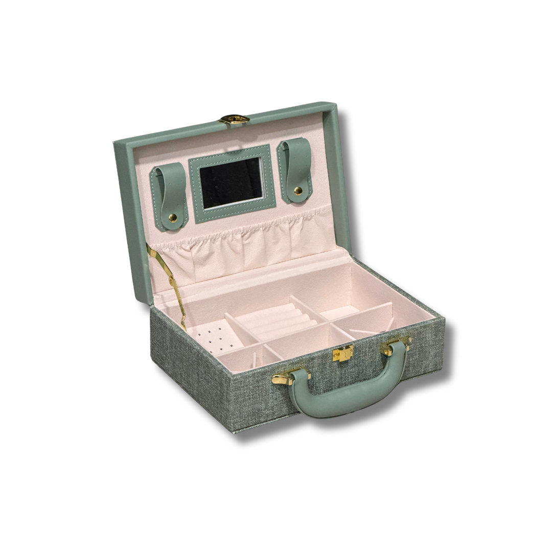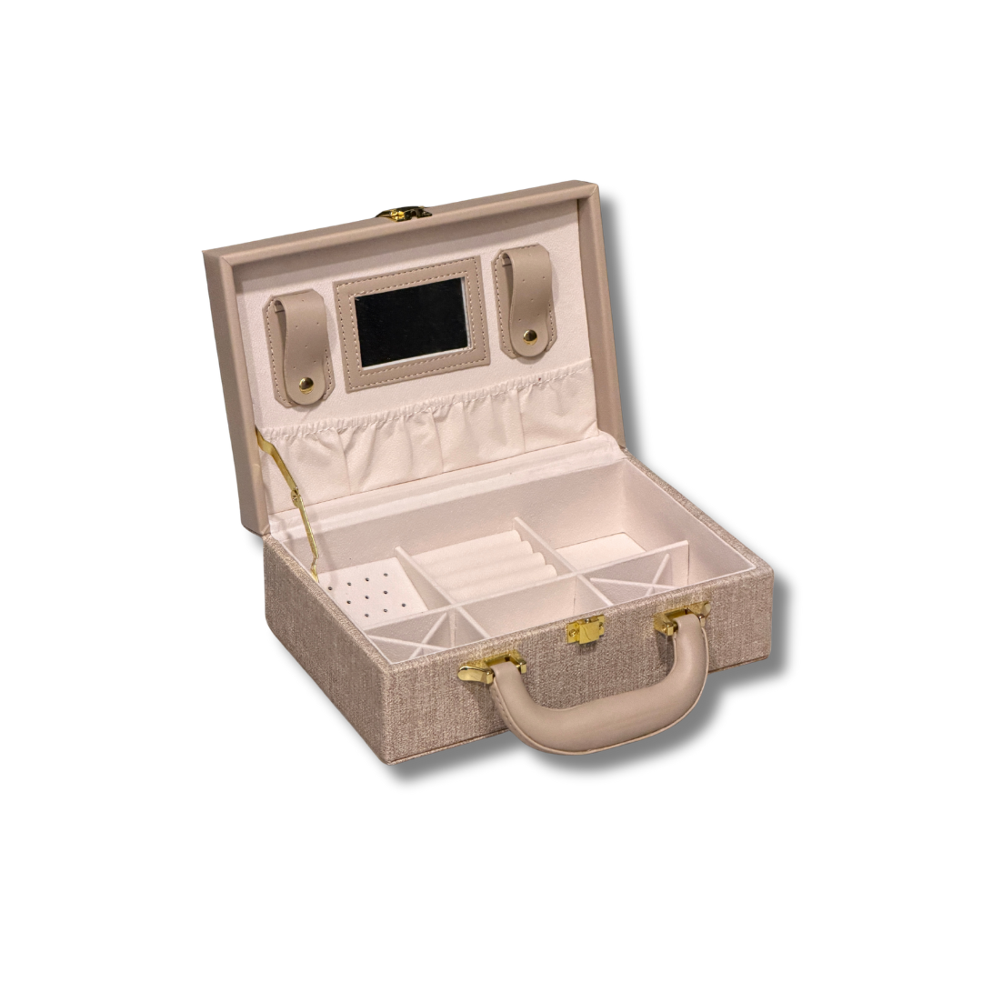 Çanta per bizhuteri është një aksesor elegant dhe praktik, i dizajnuar për të ruajtur dhe organizuar unaza, varëse, vathë dhe aksesorë të tjerë me siguri të plotë. E punuar nga lëkurë cilësore dhe me ndarje të brendshme të buta, ajo mbron bizhuteritë nga gërvishtjet dhe ngatërrimet. Kompakte dhe luksoze, ideale për udhëtime ose përdorim të përditshëm.